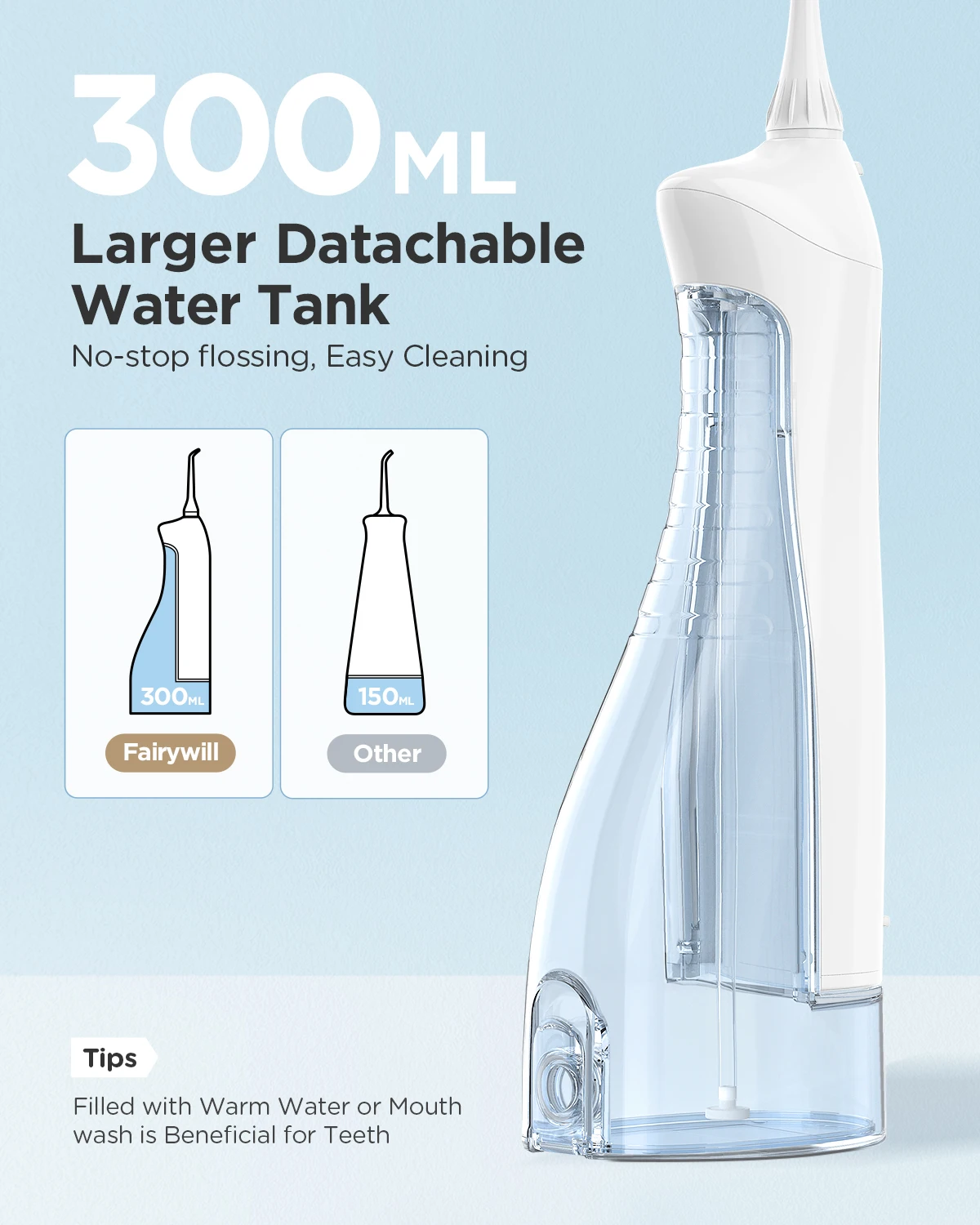 • 300ML Waterproof Teeth Cleaner :The waterproof design ensures that the device can be used in the shower or bath without any worries.