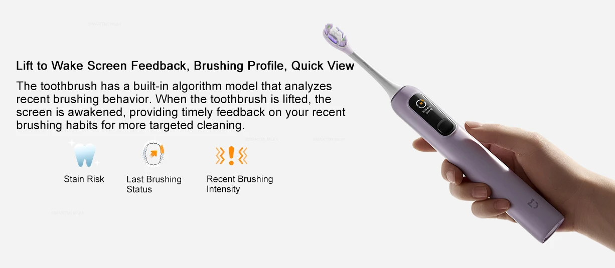 The toothbrush has a built-in algorithm model that analyzes recent brushing behavior. When the toothbrush is lifted, the screen is awakened, providing timely feedback on your recent brushing habits for more targeted cleaning.