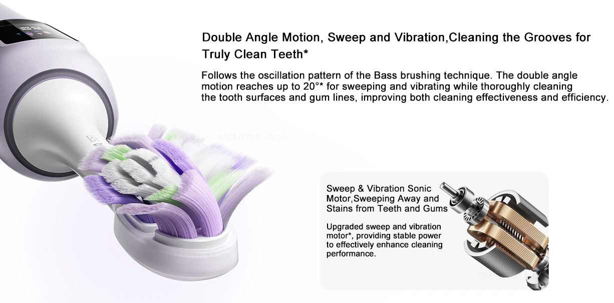 Automatically adjusts the angle and amplitude based on different tooth surface matching and cleaning modes*.